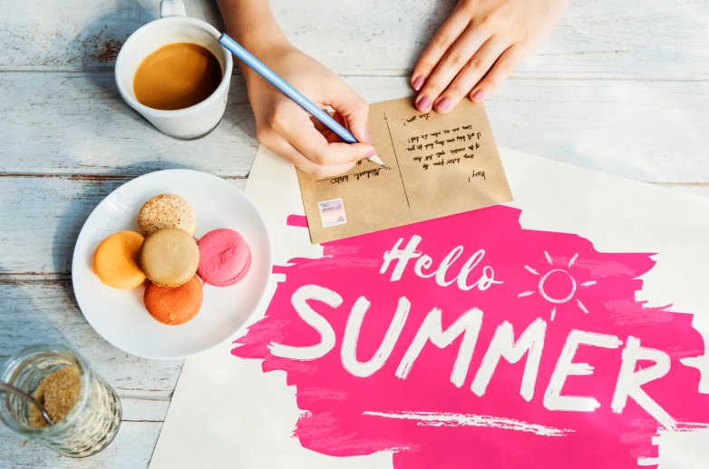 Een vrolijke kaart met: “Fijne zomer! Zorg goed voor jezelf.”